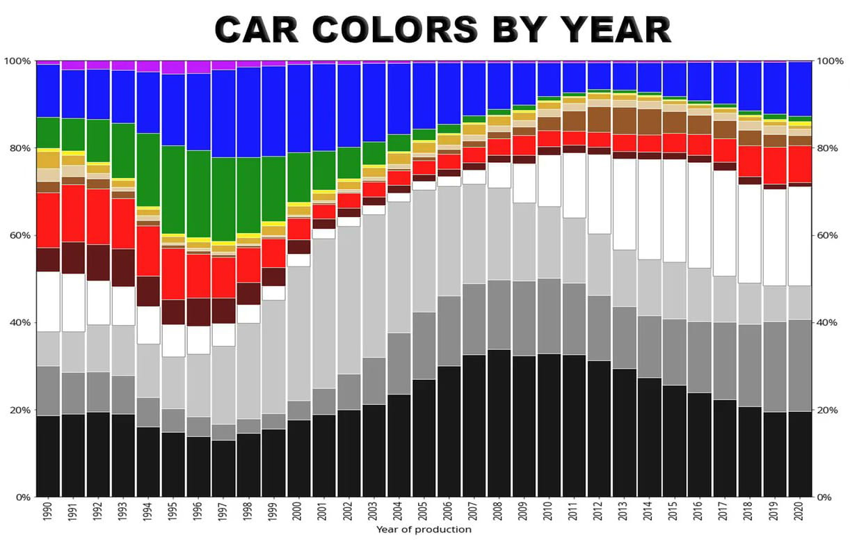 Verdwijnen kleuren langzaam uit de wereld? Eind vorige eeuw omringden we ons nog met rijke, levendige kleuren; in kleding, architectuur, interieurs en auto’s. Maar kijk nu eens om je heen: veel ingetogen, grijze, monochrome kleuren. UX-designer Elvis Hsiao schreef een leuke post over de teloorgang.