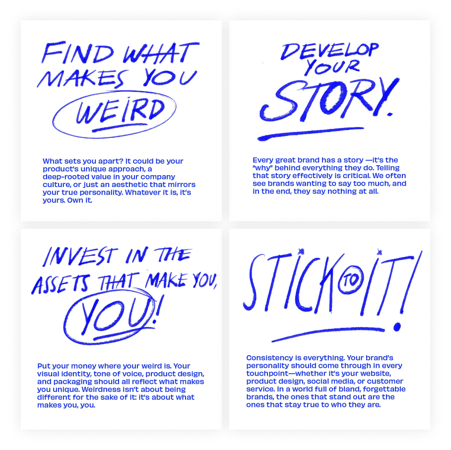 In een wereld vol blanding zorgen brand quirks voor onderscheidend vermogen. “Blanding can look great, but it lacks anything truly unique and ownable. Blanding brands flatten themselves into the same vanilla look and feel as everyone else in the name of ‘scaling.’ Let’s be real: it’s sometimes lazy. And worse—it’s forgettable.”