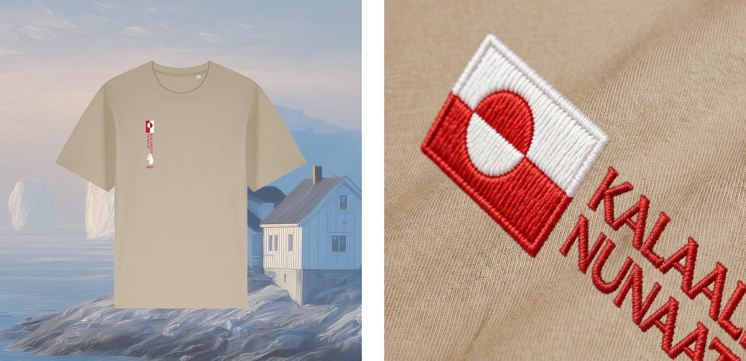 Om m’n solidariteit voor Groenland te tonen, heb ik een t-shirt ontworpen. Het bevat een aantal typisch Groenlandse symbolen, in wit en rood geborduurd. Een vriend van me, Jelmer, raakte enthousiast en we hebben de Utrechtse Katoenfabriek bereid gevonden om de shirts in kleine oplage te produceren.