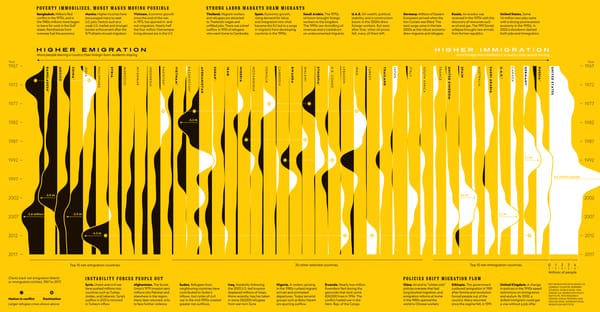 De Information is Beautiful Awards zijn weer uitgereikt aan de beste data visualisaties van dit jaar. Een van de gaafste vind ik Migration Waves waarin je per land ziet hoeveel immigratie en emigratie er de afgelopen 50 jaar is geweest.