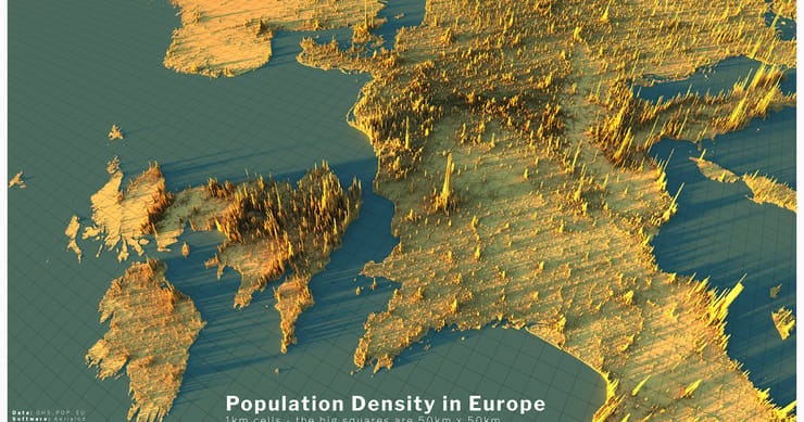 Een visualisatie die droge, demografische data invoelbaar maakt. Alasdair Rae visualiseerde de Europese bevolkingsdichtheid dmv 3d-mapping.