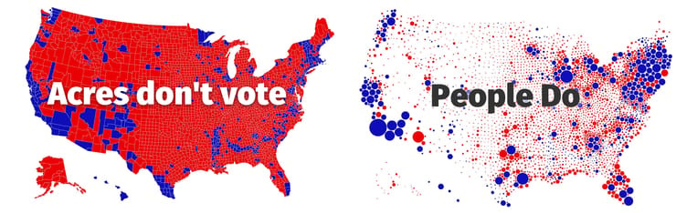 Een visualisatie van de Belgische ontwerper Karim Douïeb van een jaar geleden werd opeens actueel en ging viral. Hoewel het cijfers zijn van de Amerikaanse presidentsverkiezingen van 2016, is de boodschap ook nu relevant: Land doesn’t vote. People do. Dit is de kracht van data visualisatie. Meesterwerk. 👌