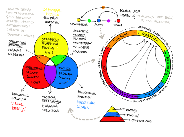Volgens Dennis Hambeukers van ontwerpbureau Zuiderlicht speelt het ontwerpproces zich af op drie niveau's: hoofd (strategie), hart (tactiek) en handen (uitvoering). Ze zijn gelijkwaardig aan elkaar en vormen een venn diagram met in totaal zes gebieden. Interessant model en mooi in z'n eenvoud.
