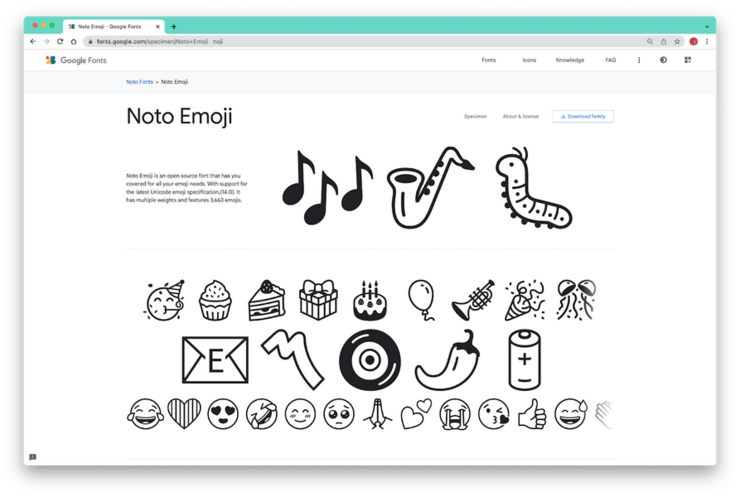 Noto is een über typeface. Het heeft als doel om alle Unicode-entries te voorzien van een karakter. Zodat zo'n ontbrekend-teken-icoon dat lijkt op een blok tofu (vandaar de naam Noto - No tofu) wordt voorkomen. Daar zijn nu emoji's aan toegevoegd. Weliswaar in zwartwit, maar daardoor niet minder tof. En gratis te gebruiken van Google Fonts.