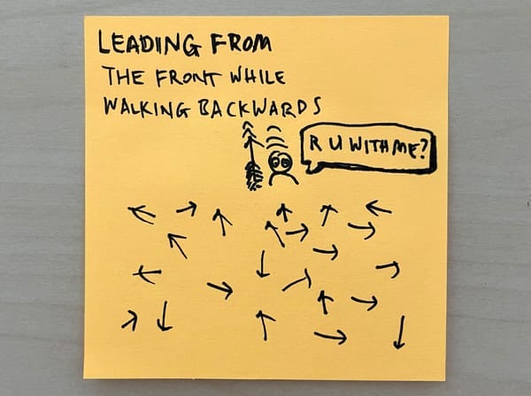 Maar er is een vierde manier van leidinggeven. Hierin loop je achterwaarts voorop en is je gezicht naar het team gericht. Zo ben je in staat steeds te checken of iedereen nog meeloopt.